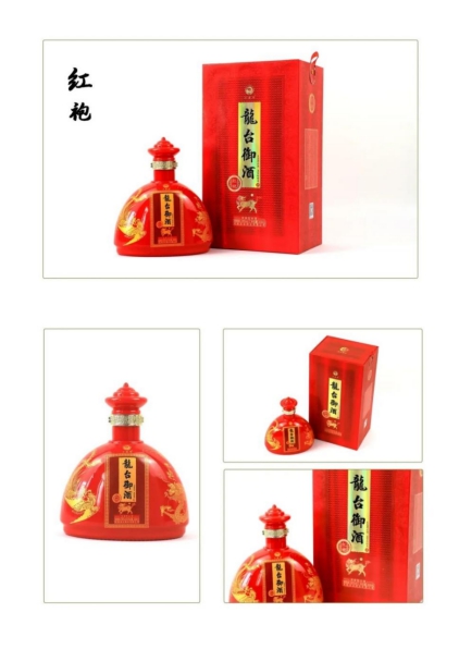 紅袍產(chǎn)品以清朝官服為主要設(shè)計(jì)理念,以大氣喜慶的中國(guó)紅顏色為酒瓶和酒盒主體外觀色。瓶體、盒體以協(xié)調(diào)圓潤(rùn)為基調(diào),配以龍鳳和麒麟圖案,寓意龍鳳呈祥,麒麟送子和步步高升,美滿和諧之意。